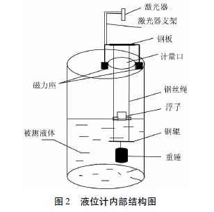 鋼絲繩用作浮子的導(dǎo)軌,鋼絲繩的上端用鋼板來固定,鋼板中間開了一個(gè)和激光器筒直徑大小一致的圓孔,以便激光的發(fā)射和接收。鋼輥和重錘用來固定鋼絲繩的下端。