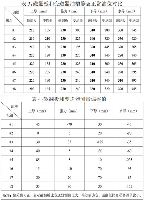 從表3,可以看出磁翻板油槽油位與監(jiān)控變送器測(cè)量值存在偏差,具體偏差值見表4: