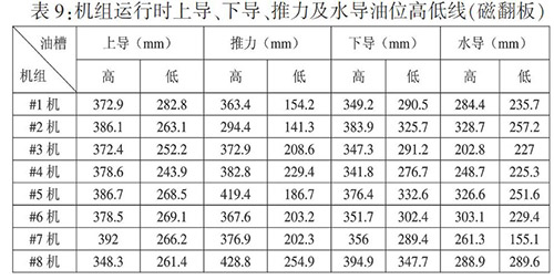 從表8可以看出,上導(dǎo)波幅均在靜態(tài)油位以上,容易出現(xiàn)高油位報(bào)警;推力和下導(dǎo)油槽油槽波幅均上下跨越靜態(tài)油位,容易出現(xiàn)高油位、低油位報(bào)警;水導(dǎo)油槽波幅在靜態(tài)油位以下,容易出現(xiàn)低油位報(bào)警。