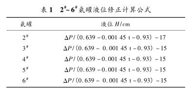因液氨密度受溫度影響大,且每個(gè)氨罐的保溫效果也有差異,故如需準(zhǔn)確測量氨罐液位,必須引入溫度測量。對2#~6#氨罐分別進(jìn)行卸壓,并引入熱電偶遠(yuǎn)傳至DCS系統(tǒng),對密度進(jìn)行修正,修正公式為Q液=0.639-0.00145t。經(jīng)過以上修正,2#~6#氨罐液位修正計(jì)算公式如表1所示。