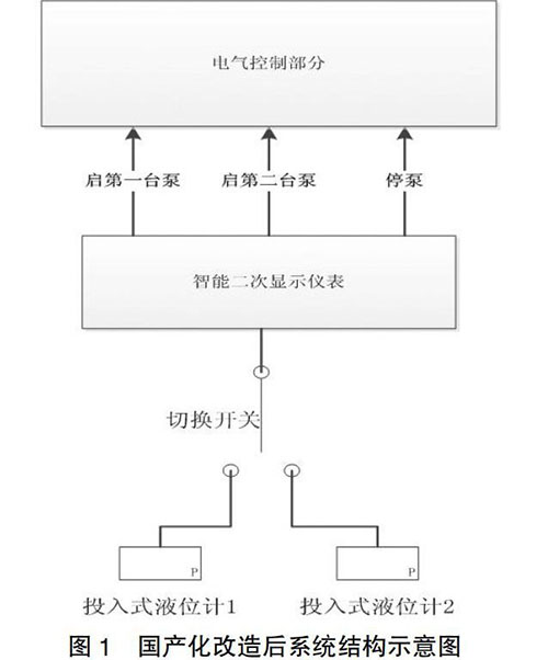 如圖1所示,國產(chǎn)化改造后,地面排水控制系統(tǒng)用防凍液液位計測量地坑液位,用智能二次儀表接收防凍液液位計的信號,并根據(jù)設定的液位報警值向電氣控制部分發(fā)出啟動和停運排水泵信號,控制系統(tǒng)配置了2個防凍液液位計,通過1個轉(zhuǎn)換開關,可以選擇投入使用的液位計,也可對比兩個液位計的測量數(shù)據(jù),通過定期巡檢發(fā)現(xiàn)液位測量故障。
