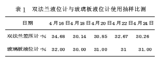 我公司200m³液氨球罐上裝有一臺3851DP雙法蘭差壓液位計(jì)(量程:-62.04~20.79KPa)、一臺磁翻板液位計(jì)和一臺玻璃板式液位計(jì)。磁翻板液位計(jì)由于其腔體未能定期檢修使磁柱顏色不變,因而無法檢測;另一臺雙法蘭差壓液位計(jì)運(yùn)行穩(wěn)定,但測量值同玻璃板式液位計(jì)顯示有誤差。2014年4月儀表人員抽樣比測記錄數(shù)據(jù),見表1所示。因老式玻璃板式液位計(jì)沒有詳細(xì)刻度,該數(shù)據(jù)為粗略目視值。
