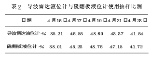 另外,2012年新建20萬t/a合成氨系統(tǒng)2000m³液氨球罐上安裝有一臺LD51纜式導(dǎo)波雷達(dá)液位計(jì)(位號:LT1201A)和一臺磁翻板液位計(jì),該信號均引入DCS顯示。在開始安裝調(diào)試過程中發(fā)現(xiàn)雷達(dá)液位計(jì)與磁翻板液位計(jì)顯示不一致,經(jīng)檢查發(fā)現(xiàn)導(dǎo)波雷達(dá)液位計(jì)取樣管原始高度不正確,經(jīng)重新調(diào)整并對其相關(guān)參數(shù)進(jìn)行設(shè)定后測量顯示一致。長期穩(wěn)定運(yùn)行,給工藝控制提供了準(zhǔn)確數(shù)據(jù),滿足了工藝要求,有效地保障了設(shè)備和人身安全。2014年4月儀表人員抽樣比測記錄數(shù)據(jù),見表2所示。