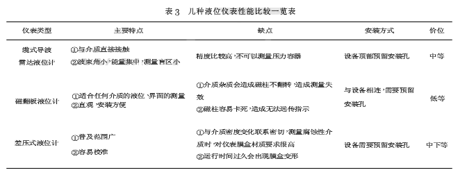 通過以上案例分析,幾種液位檢測儀表在液氨儲罐上的應(yīng)用各有不同的使用效果,現(xiàn)將其性能指標(biāo)歸納如下,供設(shè)計(jì)選型及儀表維護(hù)人員參考。