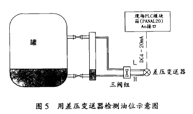 用差壓法檢測油位(△P=p•h)。在上、下聯(lián)通管處開孔取壓,選用智能差壓變送器(*大測量范圍0~10kPa,耐壓力1.6 a,輸出DC 4~20mA,帶顯示表)檢測差壓。標(biāo)定時(shí),取工作用油壓力0~750ram油柱(為保證p值不變)作為輸入,并使表頭指示為0%~100%(線性關(guān)系)即可。差壓變送器輸出信號接入現(xiàn)場PLC模塊箱PANAL20的模擬量輸入通道,與軋線計(jì)算機(jī)聯(lián)網(wǎng)(見圖5)。