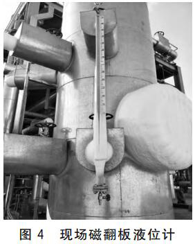 現(xiàn)場磁翻板液位計(圖4)由于儲罐壓力偏高,正常生產時為3MPa,導致磁翻版液位計浮子被壓扁。解決方法:尋找能夠生產耐高壓低密度液位計浮子廠家。