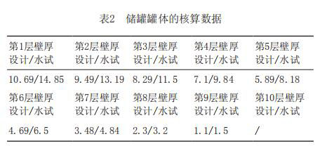 根據(jù)GB50341-2014《立式圓筒形鋼制焊接油罐設(shè)計(jì)規(guī)范》中的規(guī)定,儲(chǔ)罐內(nèi)徑小于60m,采取的是定設(shè)計(jì)點(diǎn)發(fā)進(jìn)行核算[3],核算出的儲(chǔ)罐的每層罐壁的所需厚度(mm)(設(shè)計(jì)與試水條件下)見表2。