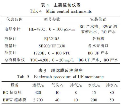 超濾膜組件和反滲透膜組件前均設(shè)置保安過濾器, 濾芯和膜組件規(guī)格參數(shù)見表 3。