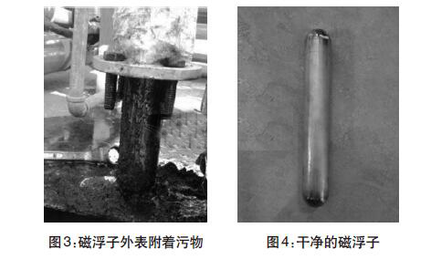 經(jīng)過兩年多運(yùn)行,污水罐內(nèi)可能沉淀污泥雜質(zhì)導(dǎo)致液位計示數(shù)不準(zhǔn)。現(xiàn)場拆卸液位計,并且對浮球和磁浮子進(jìn)行清洗。(圖3-圖4)