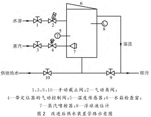 針對(duì)造成熱水裝置問題的原因,提出了以下改進(jìn)原則:為了改進(jìn)后水罐便于維修和保養(yǎng),確定把水罐改成水箱;為解決水溫分層以及設(shè)備震動(dòng),確定把環(huán)形加熱管更換為蒸汽噴射器;為解決液位檢測失效,確定把浮球磁翻板液位計(jì)更換為浮球液位計(jì);為解決水溫控制波動(dòng)大,把蒸汽進(jìn)汽角閥改為帶定位器的氣動(dòng)控制閥,以便調(diào)節(jié)蒸汽進(jìn)汽量。