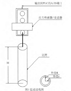 沉筒式液位計(jì)主要由拉力傳感器、變送器及沉筒組成,拉力傳感器內(nèi)部貼有電阻應(yīng)變片,通過(guò)信號(hào)線將變送器輸出的標(biāo)準(zhǔn)電流信號(hào)送到PLC的A/D輸入端口,用以進(jìn)行數(shù)據(jù)處理和遠(yuǎn)程控制。沉筒由上下兩端封閉的空心材料制成,并懸掛在拉力傳感器的受力端,其余部分投入到儲(chǔ)料罐中,拉力傳感器用法蘭盤或自帶螺紋固定在儲(chǔ)料罐的上方,結(jié)構(gòu)如圖1所示。