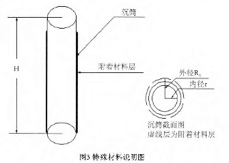當(dāng)材料本身有粘附性和凝固性時(shí),沉筒的表明會(huì)附著一層或幾層材料,導(dǎo)致其體積發(fā)生變化,自身的重量也發(fā)生變化,其變化如圖3所示,其中沉筒截面積中虛線層為附著材料層,設(shè)此時(shí)沉筒外徑為R1。