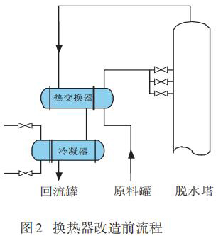冷凝器換熱面積由 367.8 m2改為 344 m2,管程塔頂氣壓力降小于 10 kPa,換熱能力與原設(shè)備相同;進(jìn)料預(yù)熱器換熱面積由 260.3 m2改為 344 m2,管程塔頂氣壓力降及循環(huán)水流速均在合理范圍內(nèi),均滿足裝置操作彈性要求,換熱器改造前、后的流程分別見圖2,3。