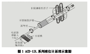 南10站試用磁致伸縮液位計(jì)類型為ACD-1DL系列,該類型液位計(jì)主要傳輸部分為:波導(dǎo)絲、浮子磁環(huán)、永久磁環(huán)、傳輸部分及檢測機(jī)構(gòu)等部分組成。傳感器的電路在波導(dǎo)絲上激勵出脈沖電流,該電流沿波導(dǎo)絲傳播時會在波導(dǎo)絲的周圍產(chǎn)生脈沖電流磁場。脈沖電流磁場與浮子產(chǎn)生的磁場相遇,在相遇空間產(chǎn)生一個扭轉(zhuǎn)波脈沖,脈沖沿波導(dǎo)絲傳回并由檢出機(jī)構(gòu)檢出,通過測量脈沖電流與扭轉(zhuǎn)波的時間差可以精確地確定浮子所在液面位置。