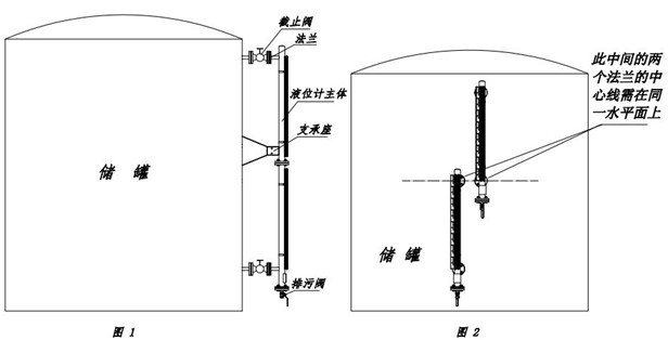 (9)對于超長型磁翻板液位計(jì)(測量范圍大于4m),物流運(yùn)輸成本較高,一般進(jìn)行分段制作。分段方法有以下兩種形式,可根據(jù)客戶現(xiàn)場設(shè)備的實(shí)際接口形式而定。圖1形式是將一臺磁翻板液位計(jì)分成兩段,安裝時先組裝對接好連接法蘭,在進(jìn)行對接操作時可適當(dāng)松開顯示面板,支承點(diǎn)的數(shù)量根據(jù)磁翻板液位計(jì)的長短來定。圖2形式是分成兩臺或若干臺獨(dú)立的磁翻板液位計(jì),這種形式的結(jié)構(gòu)要求儲罐中間的兩塊法蘭的中心線處在同一水平面上,以實(shí)現(xiàn)液位顯示的連續(xù)性。