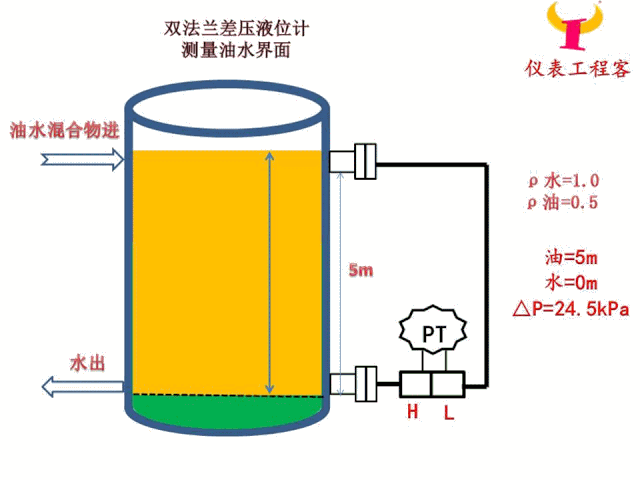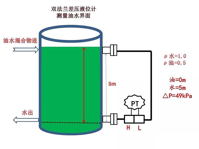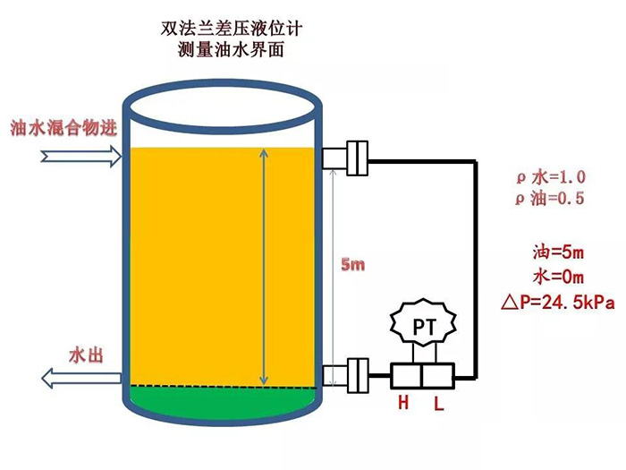 水的密度為1.0,油的密度為0.5,變送器的硅油密度為0.93,測(cè)量范圍5m,求水面在5m時(shí)變送器的差壓值。