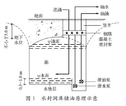 1.1 儲(chǔ)油原理水封洞庫(kù)通過(guò)人工在地下巖石中開(kāi)挖形成,其密封是通過(guò)地下水向洞內(nèi)滲透實(shí)現(xiàn),即水封洞庫(kù)必須建在穩(wěn)定的地下水位線(xiàn)以下一定的深度,洞罐的埋深與洞室儲(chǔ)存介質(zhì)的*大工作壓力、工程地質(zhì)和水文地質(zhì)條件、穩(wěn)定的地下水位等因素有關(guān),其埋深應(yīng)保證洞庫(kù)周?chē)牡叵滤畨毫Υ笥诙磧?nèi)儲(chǔ)存介質(zhì)的壓力。正常儲(chǔ)存時(shí),洞外部地下水壓力大于洞內(nèi)介質(zhì)壓力,地下水只能向洞內(nèi)滲透,而洞內(nèi)介質(zhì)不能向洞外滲漏,同時(shí)利用油比水密度小以及油水不能混溶的特點(diǎn),滲入洞內(nèi)的水沿洞壁匯集到洞底部形成水墊層,從而達(dá)到將所儲(chǔ)介質(zhì)封在洞內(nèi)的目的。滲入洞內(nèi)的水可由油水界面檢測(cè)儀表進(jìn)行檢測(cè),待達(dá)到一定高度時(shí),用安裝在洞內(nèi)的潛水泵將水排出洞外。水封洞庫(kù)儲(chǔ)油方法有固定水位法和變動(dòng)水位法,采用變動(dòng)水位法儲(chǔ)油新鮮水的需求量和污水處理量大,運(yùn)行費(fèi)用高,因而目前多采用固定水位法,儲(chǔ)油原理示意如圖1所示。