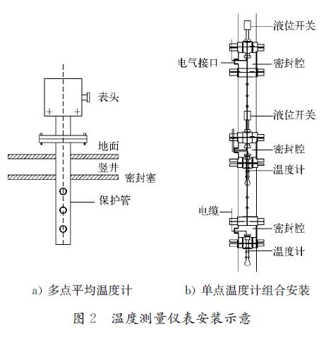 2)2)采用單點(diǎn)溫度計(jì)用組合套管安裝的方式,將幾支單點(diǎn)溫度計(jì)組合安裝在一根不銹鋼套管內(nèi),測(cè)量不同高度油品的溫度。單點(diǎn)溫度計(jì)與液位開(kāi)關(guān)合用1根套管,安裝示意如圖2b)所示。