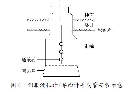 儀表安裝應(yīng)便于儀表維護(hù)、更換及觀(guān)測(cè),儀表的觀(guān)測(cè)面應(yīng)朝向操作通道,周?chē)粦?yīng)有妨礙維修儀表的物件,因而洞罐液位計(jì)、界面計(jì)和多點(diǎn)平均溫度計(jì)的變送單元均安裝在豎井口??紤]到洞罐埋設(shè)深度及洞罐儀表檢測(cè)元件的長(zhǎng)度,為便于儀表安裝,保護(hù)洞罐儀表的檢測(cè)元件,為伺服液位計(jì)、伺服界面計(jì)及多點(diǎn)平均溫度計(jì)設(shè)置了液位計(jì)、界面計(jì)導(dǎo)向管及溫度計(jì)保護(hù)管。導(dǎo)向管、保護(hù)管安裝時(shí),從上到下的垂直誤差一般小于導(dǎo)向管、保護(hù)管口徑的10%,并徹底處理好導(dǎo)向管通液孔的毛刺;焊接必須采用套焊,焊縫必須清理干凈;安裝時(shí),必須保證洞罐儀表與導(dǎo)向管、保護(hù)管連接法蘭的水平度,一般控制在1°之內(nèi),伺服液位計(jì)、界面計(jì)導(dǎo)向管安裝示意如圖4所示。