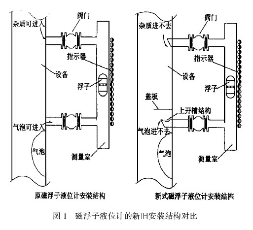 圖1四氟磁翻板液位計(jì)的新舊安裝結(jié)構(gòu)對(duì)比氣相總是要向上方或斜上方運(yùn)動(dòng),這樣,氣相就不能置換掉下部接管中的液相,也就不能進(jìn)人液位計(jì)測(cè)量室,就避免了氣泡對(duì)測(cè)量的干擾以及“亂磁”現(xiàn)象的產(chǎn)生。