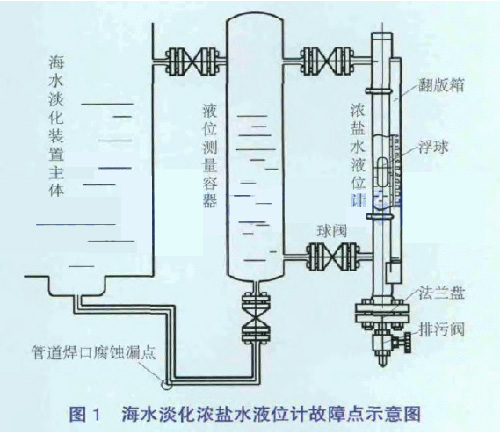 2013年12月16日0:20海淡水化裝置主體U3濃鹽水液位計開始出現(xiàn)30%~70%的波動,檢查液位計本體無異常,將液位計上、下閥門關(guān)小后,液位測量波動減小,但故障現(xiàn)象并未消失。利用高爐休風機會降海水淡化U3主體負荷并查找故障原因。將液位計上、下閥門全關(guān)閉并拆下下部絲堵,打開排污閥徹底進行排氣排污處理,檢測磁性浮子,未發(fā)現(xiàn)異常。當投運后波動現(xiàn)象存在。濃鹽水液位計更換后再次試投運,發(fā)現(xiàn)液位計液位顯示波動更大、更頻繁。經(jīng)過排查發(fā)現(xiàn)與液位測量容器(見圖1)連接的管道焊接處有漏點,對該漏點進行封堵后液位測量顯示恢復穩(wěn)定,負荷狀態(tài)生產(chǎn)恢復正常。